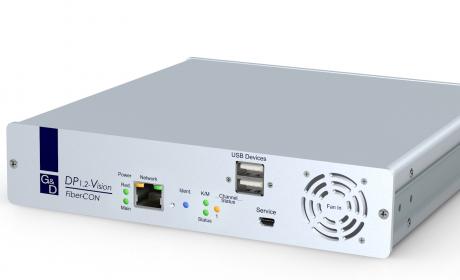 The Guntermann & Drunck DP1.2-Vision-Fiber-AR: DisplayPort (up to 4K @ 60Hz resolution) KVM extender kit with USB, PS/2 Audio & Serial support up to 400 meters over Multi-Mode Fiber cable, up to 5,000 or 10,000 meters over Single Mode Fiber cable