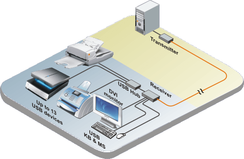 The receiver has three high speed USB 2.0 ports built in. Each port can support high output current devices of up to 500ma. Up to 13 USB 1.1 or 2.0 devices can be connected to the receiver unit using USB hubs. Typically the three USB Type A connectors on the receiver are connected to a USB keyboard, USB mouse, and a USB hub.