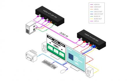 The HDX-XT-2P is an extender supporting Dual Head HDMI video signals at resolutions up to 4K/30Hz, with bi-directional audio and fully-transparent USB 2.0 up to 330 ft.