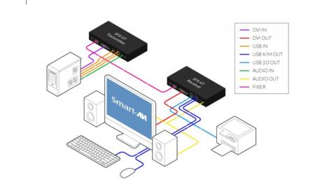 The SFX-XT is a Single Head DVI-D (1920x1200), USB 2.0, USB keyboard-mouse and stereo audio extender, sending signals up to 10 km away over a single conventional and inexpensive fiber cable. This new technology is superior to older DVI extenders that require a special fiber shielded cable to go a short distance.