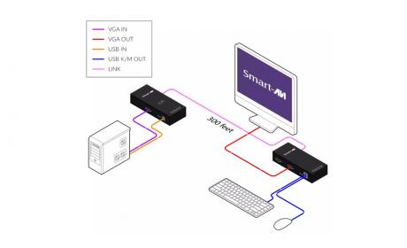 The SM-VDX-100-SH is a Single Head VGA (1920x1200) and USB keyboard-mouse extender, sending signals up to 300 ft (152 m) away over the conventional and inexpensive CAT5/5e/6 cable. This new technology is superior to older DVI extenders that require a special CAT6 shielded cable to go a short distance.