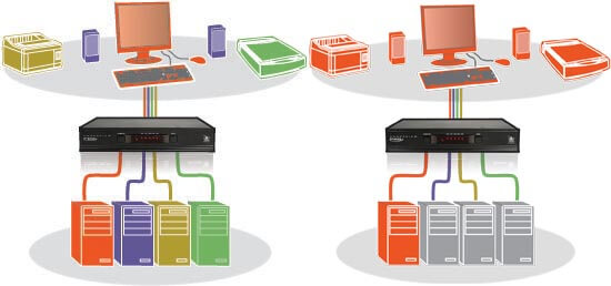 The AV4PRO-VGA is designed to enable four computers to be controlled from a single high resolution KVM console using high definition analogue VGA video links. The switch makes use of Adder's True Emulation technology which enables USB HID devices to be continuously emulated to each computer. This unique technology enables instantaneous and reliable hotkey switching whilst also supporting the extra keys and features of enhanced keyboards and mice. Furthermore, the AdderView includes two independently switchable USB 2.0 channels and an audio channel, giving the user the flexibility to attach selected peripherals to different computers.