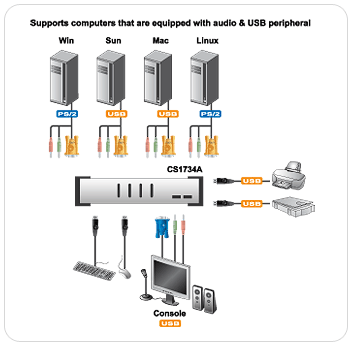 The Aten CS1734 VGA - USB 4 port KVM Switch has built-in USB on each of the front and rear panels and audio signal connectors.