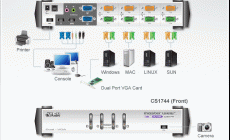 The Aten CS1744 Dual-View 4 port USB KVM Switch brings dual head video functionality to ATEN's USB KVM switch technology. Now, four dual-display computers can be accessed and controlled from a single console that consists of a USB keyboard, USB mouse, and two VGA, SVGA, or Multisync monitors.