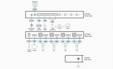 The CS784H provides multiple port selection methods, including a remote port selector, hotkeys, and mouse wheel switching to engineer for maximum flexibility. In addition, the CS784H features USB peripheral sharing, allowing users to share USB 2.0 devices such as printers, storage drives, or scanners, among all connected computers.