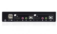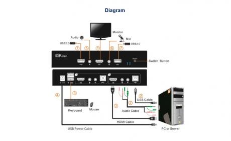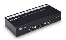 Kinan HD1102 2 port HDMI KVM switch is KVM switch with audio for small offices or home uses where users can get access to 2 computers by using a single mouse, keyboard and monitor. Users can switch between PCs or servers via front panel buttons and keyboard hotkeys.