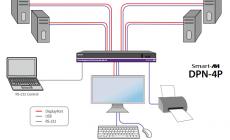 The Smart AVI DPN-4P is a dedicated multi-platform KVM switch capable of managing four 4K computers through a single DisplayPort monitor, USB keyboard, USB mouse, and other USB 2.0 devices.