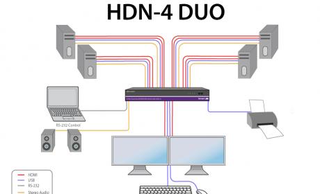 The HDN-4 DUO offers easy source switching via push buttons, hot-keys, and RS-232 commands. It also features full USB keyboard-mouse emulation and EDID pass-through technology smooth, efficient, and uninterrupted switching.