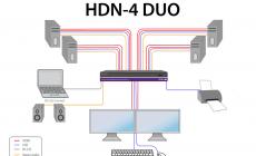 The HDN-4 DUO is a 4-port Dual Head HDMI KVM switch with USB 2.0, stereo audio, and support for 4K Ultra-HD resolution video. Users can use the HDN-4 DUO to control up to 4 computers from a single keyboard-mouse combo with two 4K-ready HDMI displays.