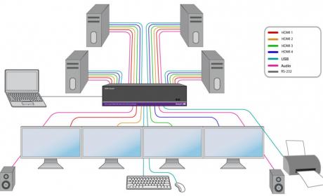 The HDN-4Quad is a 4-port KVM switch with quad-head HDMI video connectors; supports video up to 4K (3840×2160 @30Hz) Full HD resolution.