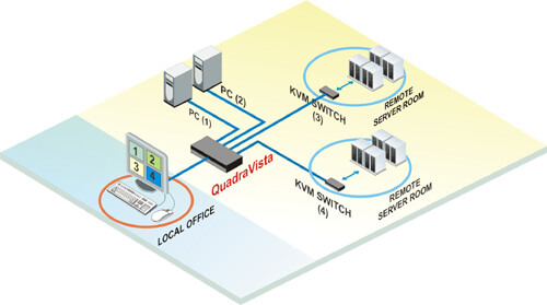 The QuadraVista allows a user to connect to, control and display four computers on a single monitor or access a KVM switch to connect to 1,000·s of computers.