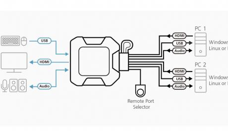 • One USB keyboard, mouse and one HDMI monitor control two HDMI computers