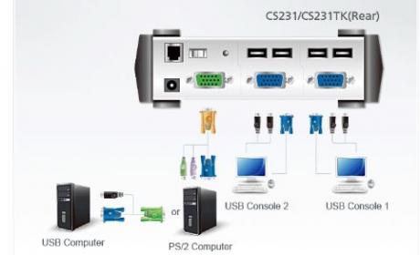 The CS231 is a powerful, micro-processor-controlled computer sharing device. It is a multi-user, single-tasking device that enables two users to share the use of a single computer - each from their own consoles (monitor, keyboard, and mouse). The CS231 supports USB consoles and both PS/2 and USB computers.
