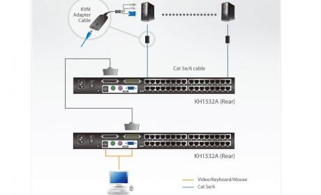 The KH1508A, KH1516A and KH1532A KVM switches are control units that allow IT administrators to access and control multiple computers from a single PS/2 or USB KVM console (keyboard, monitor, and mouse). Operators can take control of up to 8 (KH1508A), 16 (KH1516A), or 32 (KH1532A) computers. By daisy chaining up to 31 additional switches, as many as 1024 computers can be controlled from a central KVM console.
