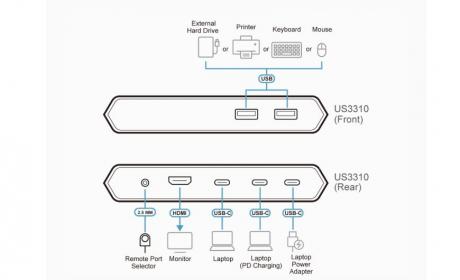 The US3310 is a 2-Port 4K HDMI USB-C KVM Dock Switch with Power Pass-through that features the combination of a multiport dock and allows one button switching between laptops and Android smart phones. With one set of display, keyboard, and mouse, users get to seamlessly control two different systems and save desk space. Thanks to the remote port selector, users are allowed to put US3310 at the most convenient location or hide it under the desk to do the quick switch.