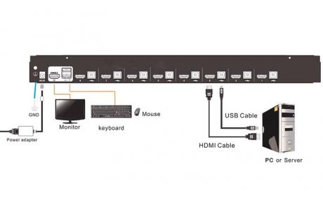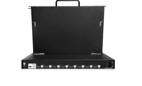 The Kinan's LH1808 1U KVM switch with monitor features an integrated 18.5” rack mount screen and keyboard & touchpad in a 1U space-saving housing. It can control 8 computers with a standard HDMI port by one USB monitor, keyboard and mouse.
