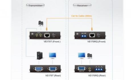 The VE170Q package consists of a transmitter (VE170T) and receiver (VE170RQ), which includes ATEN’s patented Deskew™ technology that supports resolutions up to 1280 x 1024 @ 300 m, and features manual synchronization of the RGB signals and correction of color phase and timing errors that occur over long distances.