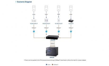 It supplies up to 15.4W of power per PSE port. Featuring HDBaseT connectivity, the VE44PB can extend HDMI connection over a long distance via Cat 6/6a cables; meanwhile, still ensures unaffected video and image quality. Besides, the status LEDs on its front panel indicates an at-a-glance overview of the connected devices, allowing you to perform real-time monitoring and trouble shooting in the case of emergency. With its compact and rack mountable design, the VE44PB can be flexibly installed anywhere between the transmitter and receiver that require remote PoH / PoE powering.