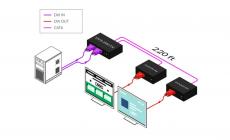 The DVS-200 extends any DVI-D signal up to 220 feet to two displays and one local screen using Cat6 cabling while retaining perfect image quality at resolutions up to 1920 x 1200. SmartAVI, Inc.’s DVS-200 allows you to extend a DVI-D signal to up to two remote displays via one small unit that also loops a signal back to your computer so local monitoring is possible and simple.