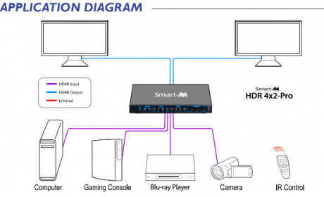 The Smart AVI 4x2 Video matrix switch to distribute and switch the latest in 4K/2K HDMI video signals, the HDR 4×2-Pro allows users to switch four HDMI inputs with two high-definition displays. Two outputs give users flexibility while routing HD audio and video signals with two displays. The HDR 4×2-Pro eliminates the need to disconnect and reconnect HDMI sources to a single display.