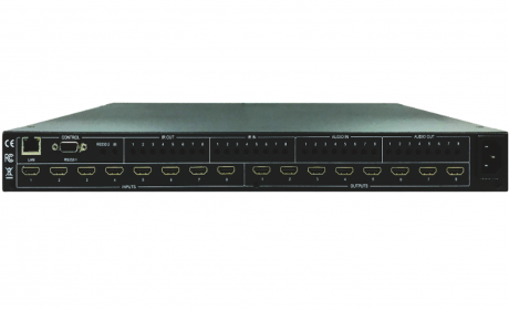 The SMS-88-18G is a high-performance 8x8 HDMI 18Gbps seamless switching matrix. This unit has a powerful independent wide range scaler for each output, allowing for up or downscaling most resolutions and refresh rates up to 4K 60Hz. Video Wall Processing to make a video wall utilizing all 8x outputs or used as a single image, along with audio embedding/de-embedding.