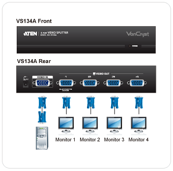 The Aten VS134A 4 port Video Separator is a signal booster and splitter that is used to take video input from a single source and direct it to four video outputs for monitors using analog signals. The signal boost obtained by using the VS-134 allows you to not only split the signal but to extend the distance so that you can send the signal to about 210 feet. This is no mean feat, your average VGA card, over a standard VGA cable, send a clear VGA signal approximately 25 feet. This makes public broadcasts from a single computer very feasible.