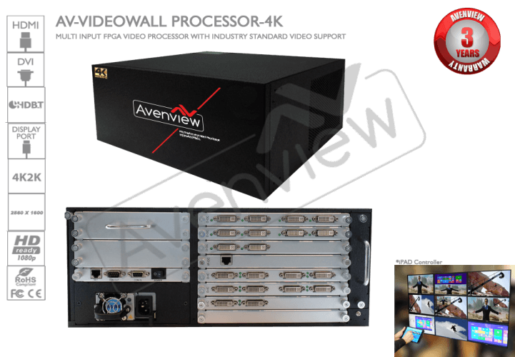 This Avenview device can Accept 4K signal formats with modular input and output board design with video connectors such as Dual Link DVI, DisplayPort and HDM which offers impeccable quality across multiple screens. The video wall processor also can mix and match our line of I/O cards which can be installed into the appointed space.