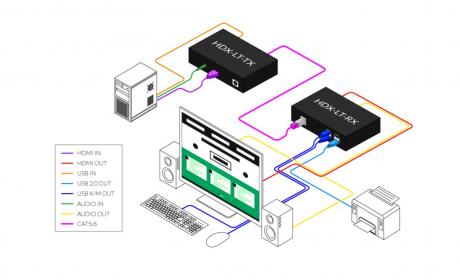 The HDX-LT is a Single Head HDMI (3840 x 2160 @ 30 Hz), USB 2.0, USB keyboard-mouse and stereo audio extender, sending signals up to 100 m (330 ft) away over a single conventional and inexpensive CAT5/5e/6 cable. This new technology is superior to older HDMI extenders that require a special CAT6 shielded cable to go a short distance.