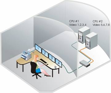 The MultiVideo DVI can be connected to an additional unit and synchronized to switch video from multiple computers.  When a switching command is sent to the master unit, it sends the same switching command to the secondary unit.  Both units are switched to the same CPU port and video is displayed on all of the connected monitors.