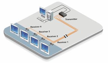 The remote displays can be extended up to 220 feet away from the controlling computer. This is ideal for many applications where the controlling computer needs to be remotely located in a secure area away from the DVI displays, especially in a retail environment.