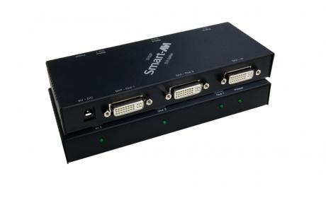 The DVS8P is a 8-port DVI splitter, which can send one DVI video source signal to eight connected DVI monitors for identical displays.