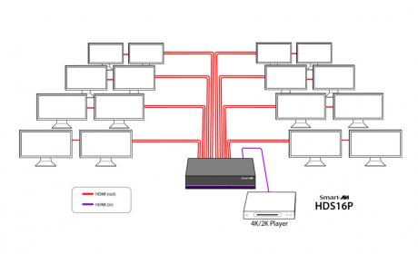 One HDMI 1.4 input signal split to 16 HDMI 1.4 sink devices